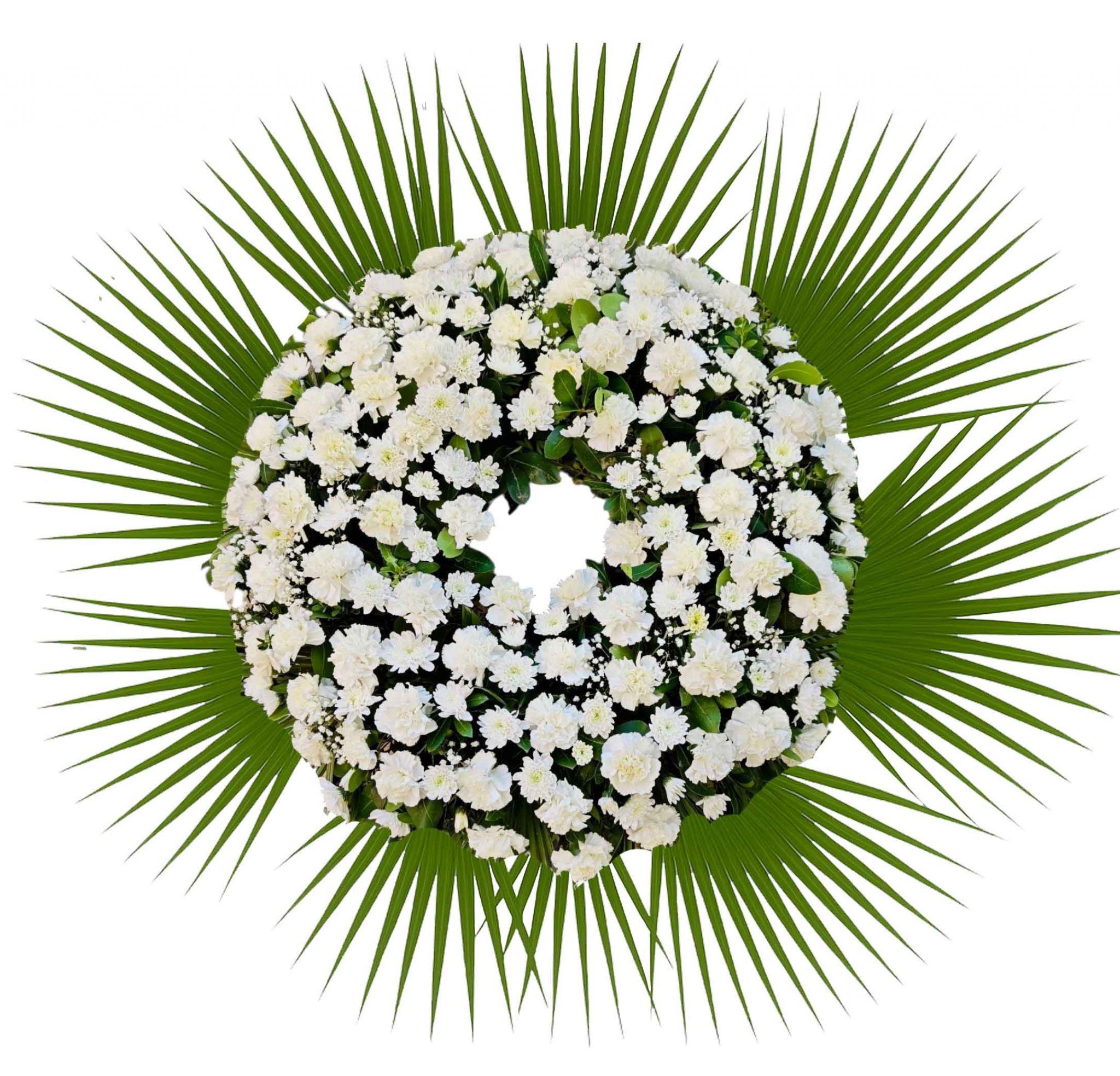 Una corona fúnebre ideal si quieres enviar un detalle floral al tanatorio mostrando tus condolencias por la pérdida de un ser querido. Creada por expertos floristas a mano en el día con flores frescas: margaritas blancas y claveles blancos. Resalta su palma alrededor de la corona y su sutil paniculata que resaltan aún más la belleza de sus flores.